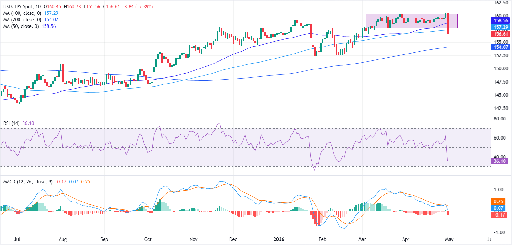 USD/JPY shows signs of stabilizing after a sharp intraday slump triggered by intervention warnings from Tokyo, which sent the Japanese Yen soaring across the board. At the time of writing, the pair is trading around 156.61 after hitting an intraday low of 155.56, its lowest level since February 27, though it remains down about 2.4% on the day.