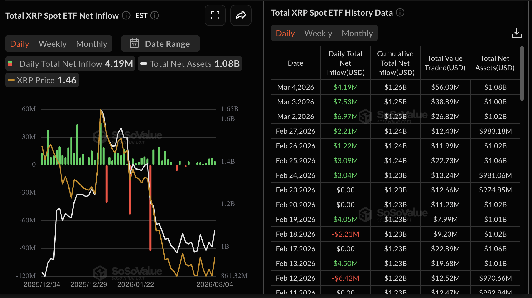 Investors seeking exposure to XRP through Exchange-Traded Funds (ETFs) continue to do so despite the war-driven uncertainty in the Middle East. Over the past seven days, US-listed spot XRP ETFs have attracted inflows, with approximately $4 million recorded on Wednesday. Canary Capital’s XRPC ETF accounted for all the inflows, as activity remained muted across the rest of the products. Cumulative inflows ticked up, reaching $1.26 billion on Wednesday, up from $1.25 billion the previous day. Total assets under management hold above $1 billion, according to SoSoValue data.