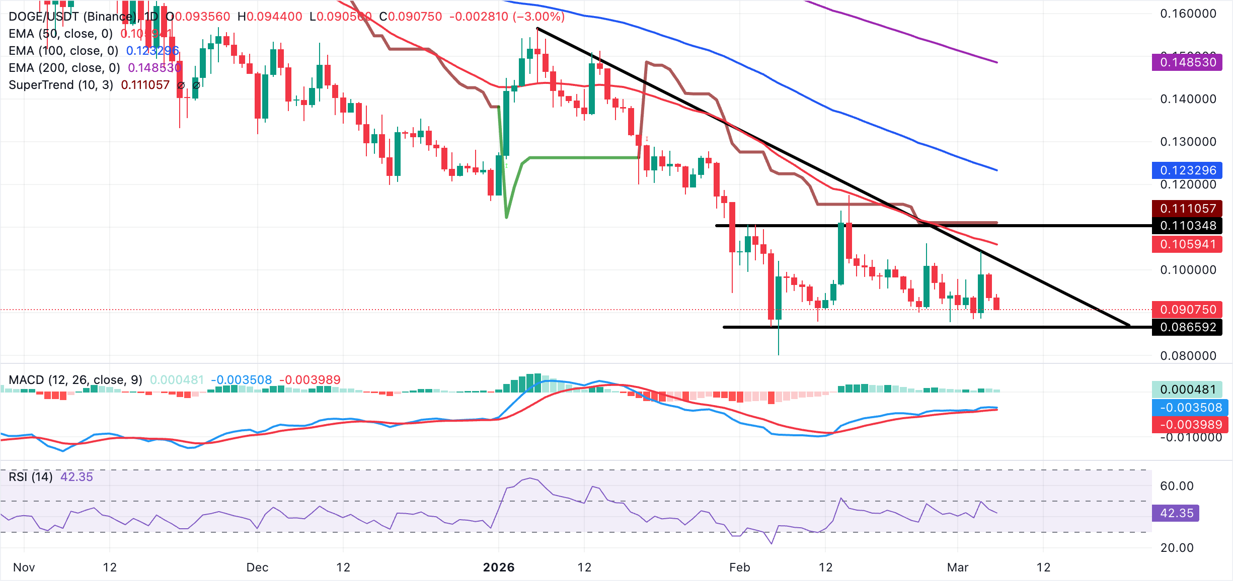 Dogecoin (DOGE) declines for the second consecutive day, trading above $0.090 at the time of writing on Friday. The meme coin peaked at a weekly high of $0.104 on Wednesday but has since been overwhelmed by volatility amid risk-off sentiment driven by the United States (US)-Israel-Iran war.