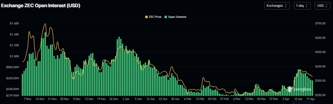 Zcash’s Open Interest (OI) has been continuously declining over the past week, dropping to $560.82 million on Friday from $763.86 million on April 10. This steadily decreasing OI amid a falling price suggests long positions are exiting the market (after a massive price rally last week), indicating a short-term bearish bias and weakening trader participation.