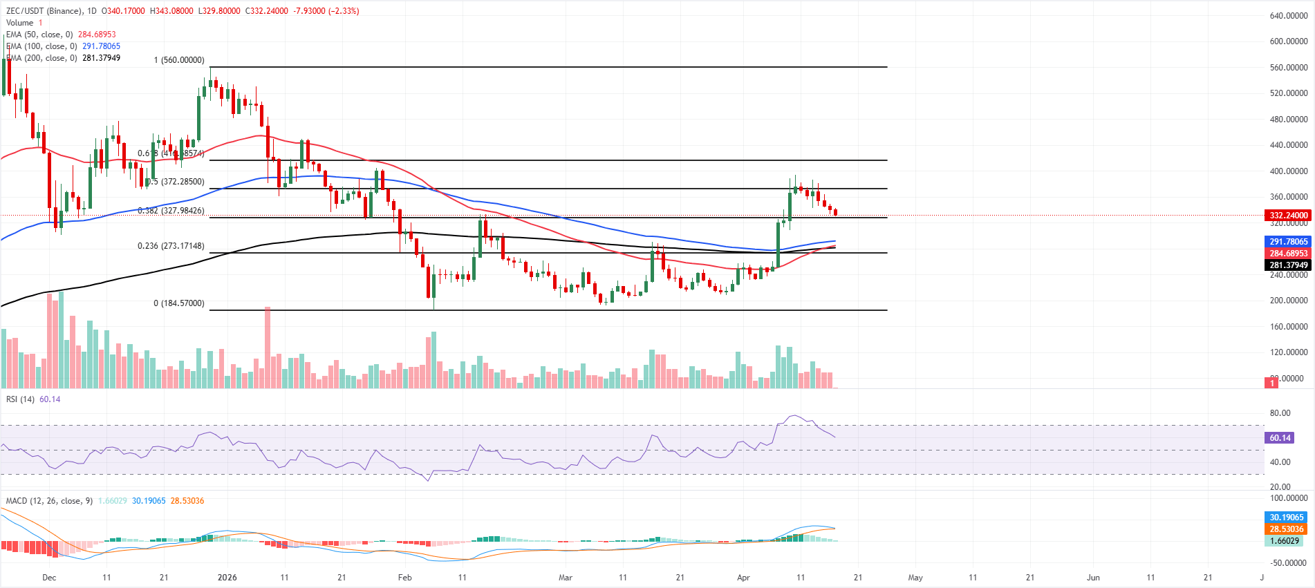 Zcash price extends its correction, trading below $333 on Friday, losing over 8% so far this week. The price action suggests ZEC is holding a constructive bullish bias as price extends above the 50-day, 100-day, and 200-day Exponential Moving Averages (EMAs), which are clustered between roughly $281 and $292. However, the massive rally last week suggests traders may be profit-taking, which could fuel a short-term price pullback.